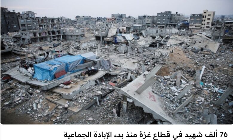 أعلن المكتب الإعلامي الحكومي في قطاع غزة، أنّ عدد الشهداء والمفقودين في القطاع تجاوز 76 ألفاً و600 منذ بدء الإبادة الجماعية في 7 أكتوبر 2023.