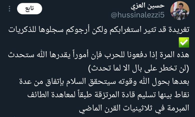 وقال نائب وزير الخارجية في صنعاء حسين العزي في منشور له على منصة “إكس” اليوم السبت: “هذه المرة إذا دفعونا للحرب فإن أموراً يقدرها الله ستحدث لن تخطر على بال الا لما تحدث”.