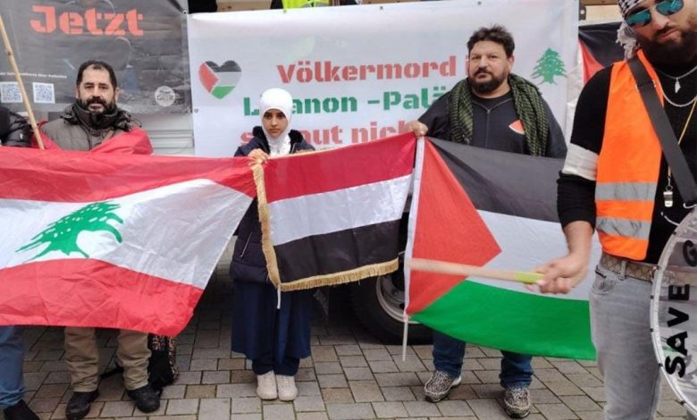 بمشاركة الجالية اليمنية.. مظاهرة بمدينة هامبورغ نصرة واسنادا للشعبين الفلسطيني واللبناني