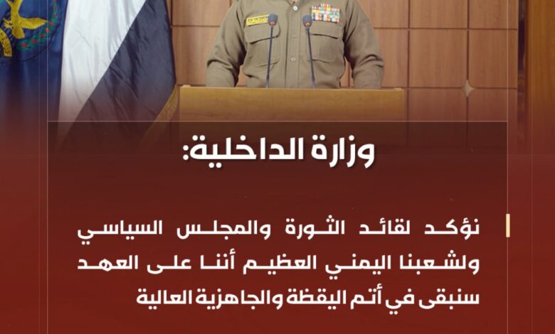 إنَّ وزارةَ الداخليةِ وهي تزفُّ هذا الإنجازَ إلى شعبِنا اليمنيِّ العظيم، لَتُعَبِّرُ عن جزيلِ شكرِها، وعظيمِ تقديرِها ليقظةِ أبنائِه الأحرار، وتؤكدُ أن تعاونَهم ويقظتَهم كانتْ وستظلُ من أهمِّ العواملِ التي أسهمتْ وتسهمُ في فضحِ مخططاتِ الأعداءِ وإفشالِها، وإنَّها لتدعو كلَّ يمنيٍ حرٍ إلى مزيدٍ من اليقظةِ والتنبهِ لتحركاتِ الأعداءِ التي تستهدفُ جبهتَنا الداخلية، وتسعى لزعزعةِ الأمنِ والاستقرار، لإيقافِ وإِضعافِ الموقفِ الشعبيِّ والرسمي، والعملياتِ العسكريةِ الداعمةِ والمساندةِ لغزةَ وفلسطين.