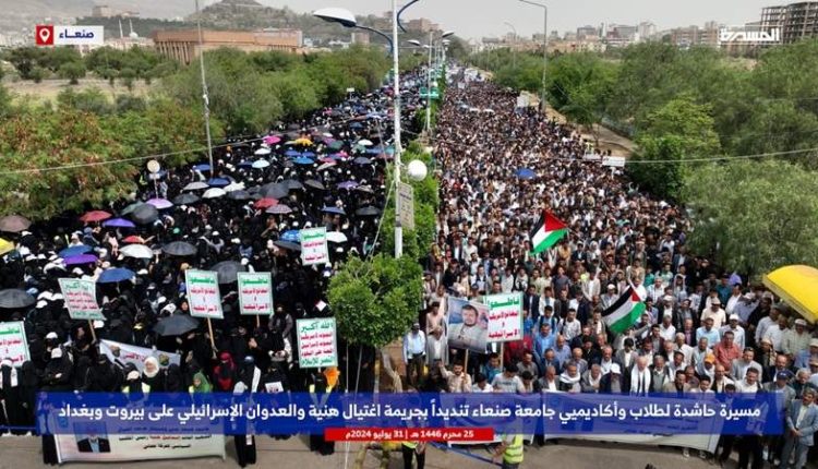 جامعة صنعاء تنظم تظاهرة حاشدة تنديدا بإغتيال هنية