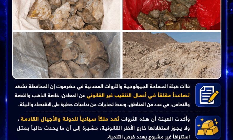 كشفت هيئة المساحة الجيولوجية والثروات المعدنية في محافظة حضرموت عن تصاعد ملحوظ في عمليات التنقيب غير القانوني عن المعادن، خصوصاً الذهب والفضة والنحاس، في عدد من مناطق المحافظة، وسط تحذيرات من تداعيات خطيرة على الاقتصاد والبيئة.