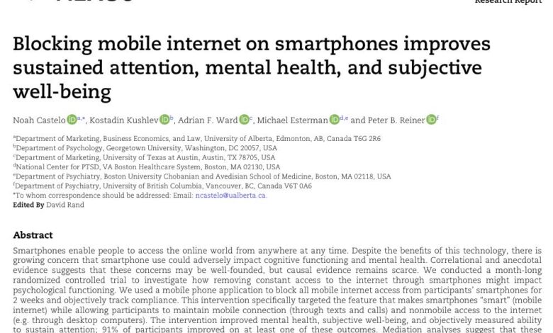 وبحسب الدراسة، قام الباحثون بفصل الإنترنت عن الهواتف المحمولة لـ467 مشاركاً لمدة أسبوعين، مع السماح لهم باستخدام المكالمات والرسائل النصية، إضافة إلى إمكانية تصفح الإنترنت عبر أجهزة الكمبيوتر.