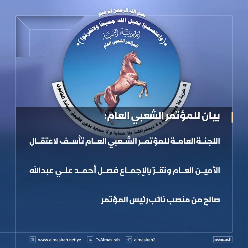 #صنعاء بيان للمؤتمر الشعبي العام: 28 أغسطس، 2025 اللجنة العامة للمؤتمر الشعبي العام تأسف لاعتقال الأمين العام وتقرّ بالإجماع فصل أحمد علي عبدالله صالح من منصب نائب رئيس المؤتمر..#انفوجرافيكhttps://t.me/fajralyom. 👈🏻 الــــــــبقية مقالات ذات صلة تصعيد جديد.. حكومة صنعاء تُفشل هجمات للفصائل الموالية للتحالف جنوباً وشرقاً وزيرا دفاع روسيا وسوريا يبحثان “التطبيق العملي لمجالات التعاون الثنائي” الاحتلال يشن غارات على غزة.. والقسام تعلن تأجيل تسليم جثة أسير إسرائيلي بسبب الخروقات #اليمن الأزمات والصراعات داخل ” الشرعية ” تضع “بن بريك” تحت الإقامة الجبرية في الرياض