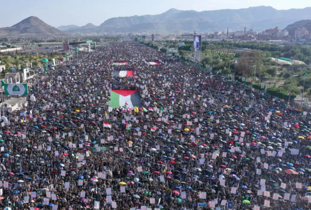 شهدت العاصمة صنعاء اليوم حشودا جماهيرية ضخمة في مسيرة مليونية حملت شعار “رفضا للمؤامرة الأمريكية الصهيونية، وثباتا مع غزة حتى النصر”.