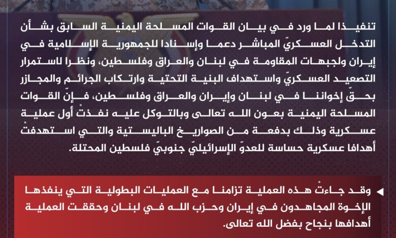 وأوضح البيان أن العملية تأتي في سياق ما وصفته بدعم وإسناد جبهات المقاومة في المنطقة، وفي ظل استمرار التصعيد العسكري واستهداف البنية التحتية في عدد من الدول.