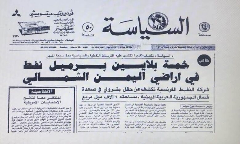 الخبر الرئيسي فيها يتحدث عن تقرير حصري يكشف عن اكتشاف حقل بترولي ضخم يُقدر بخمسة بلايين برميل نفط في شمال اليمن (الجمهورية العربية اليمنية آنذاك)، وتحديداً في منطقة صعدة، من قبل شركة نفط فرنسية (Compagnie Française des Pétroles) والتي أصبحت فيما بعد (Total).التقرير وصف الحقل بأنه قد يكون خامس أكبر حقل بترولي في العالم في ذلك الوقت..!! 📌 المعروف أن الاكتشاف التجاري الأول للنفط في اليمن الشمالي تم الإعلان عنه رسميا في يوليو 1984 بواسطة شركة هنت الأمريكية، وبدأ الإنتاج في 1987 من حقل مأرب..📌 السؤال الذي يطرح نفسه لماذا لم نسمع شيء عن نفط صعدة والجوف منذ بداية الثمانينيات وحتى اليوم.. اين اختفت تلك النتائج والتقارير.. والابار والنفط..؟!!