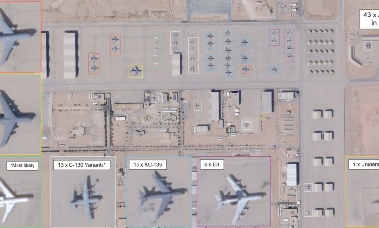 أفاد ويليام غودهيند، محلل الصور الجنائية في منظمة “كونتيستد غراوند”، لوكالة رويترز، أن الطائرات الظاهرة في صورة بتاريخ 21 فبراير/شباط، تضمنت 13 طائرة بوينغ KC-135 ستراتوتانكر وست طائرات بوينغ E-3 سينتري (أواكس)، من بين 29 طائرة كبيرة ذات أجنحة مائلة كانت متوقفة في القاعدة.
