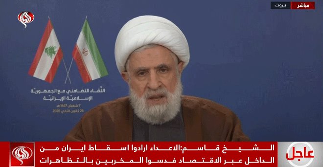 وشدد قاسم على أن حزب الله «يؤمن بقيادة الولي الفقيه ومرتبط بها فكريًا وعقائديًا»، لافتًا إلى أن أي تهديد يطال الإمام الخامنئي «يعني تهديد عشرات الملايين من أتباع هذا القائد»، وهو أمر «لا يمكن السكوت عنه». وفي هذا السياق، قال إن الحزب «معنيّ بكل الإجراءات اللازمة لمواجهة هذا التهديد».