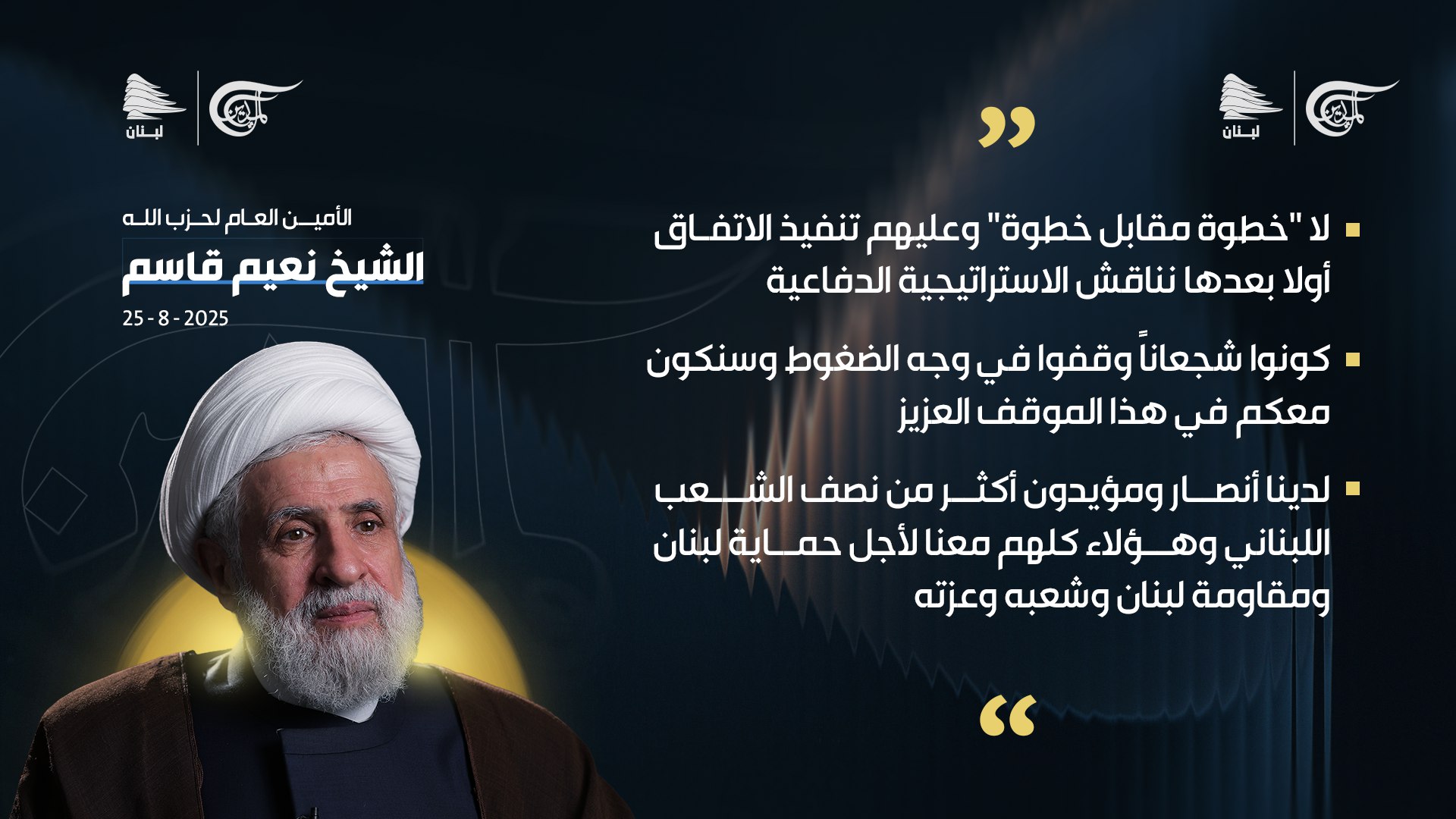 نعيم قاسم: “لدينا أنصار ومؤيدون أكثر من نصف الشعب اللبناني وهؤلاء كلهم معنا لأجل حماية لبنان ومقاومة لبنان وشعبه وعزته” 25 أغسطس، 2025 انفوجرافيك #فجر_اليوم//من كلمة الأمين العام لـ #حزب_الله الشيخ نعيم قاسم #لبنانhttps://t.me/fajralyom. 👈🏻 الــــــــبقية مقالات ذات صلة إيران تحذر واشنطن: التحركات العسكرية الأمريكية تهدد أمن الكاريبي وأمريكا اللاتينية السيد #الحوثي : الإجرام الصهيوني الرهيب في غزة يستحق أن يوصف بأنه جريمة القرن كتائب القسام تهاجم موقع “الأحواض” وتدمر دبابتين “ميركافاه” جنوب غزة غزة.. عامان على السابع من أكتوبر: السر المكنون للصمود والمقاومة