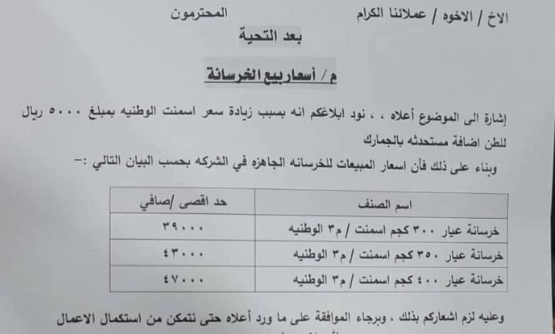 وقال البيان “ما تم هو تحصيل عمولة استيراد وتنظيم تسويق الأسمنت والكلنكر بموجب محضر موقع بين الوزارتين ومؤسسة إنتاج وتسويق الأسمنت من جهة وتجار ومستوردي الأسمنت والكلنكر من جهة أخرى، استناداً إلى القرار الجمهوري الصادر بحصر الاستيراد عبر مؤسسة الأسمنت، ولن يترتب عليها أي زيادة في الأسعار والمخزون متوفر في الأسواق ولدى مطاحن الأسمنت في القطاع الخاص بكميات كافية”.