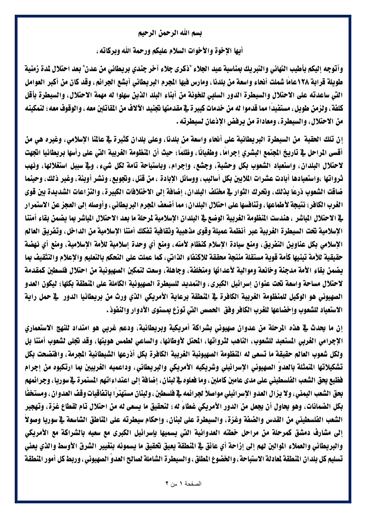 بسم الله الرحمن الرحيم أيها الإخوة والأخوات السلام عليكم ورحمة الله وبركاته، وأتوجه إليكم بأطيب التهاني والتبريك بمناسبة عيد الجلاء “ذكرى جلاء آخر جندي بريطاني من عدن” بعد احتلال لمدة زمنية طويلة قرابة 128عامًا شملت أنحاء واسعة من بلدنا، ومارس فيها المجرم البريطاني أبشع الجرائم، وقد كان من أكبر العوامل التي ساعدته على الاحتلال والسيطرة الدور السلبي للخونة من أبناء البلد الذين سهلوا له مهمة الاحتلال، والسيطرة بأقل كلفة، ولزمن طويل، مستفيدًا مما قدموا له من خدمات كبيرة في مقدمتها تجنيد الآلاف من المقاتلين معه، والوقوف معه؛ لتمكينه من الاحتلال، والسيطرة، ومعاداة من يرفض الإذعان لسيطرته. إن تلك الحقبة من السيطرة البريطانية على أنحاء واسعة من بلدنا، وعلى بلدان كثيرة في عالمنا الإسلامي، وغيره هي من أقسى المراحل في تاريخ المجتمع البشري إجرامًا، وطغيانًا، وظلمًا؛ حيث أن المنظومة الغربية التي على رأسها بريطانيا اتجهت لاحتلال البلدان، واستعباد الشعوب بكل وحشيةٍ، وجشع، وإجرام، وباستباحة تامة لكل شيء، وفي سبيل استغلالها، ونهب ثرواتها ،واستعبادها أبادت عشرات الملايين بكل أساليب، ووسائل الإبادة ، من قتل، وتجويع، ونشر أوبئة، وغير ذلك، وحينما ضاقت الشعوب ذرعًا بذلك، وتحرك الثوار في مختلف البلدان، إضافة إلى الاختلافات الكبيرة، والنزاعات الشديدة بين قوى الغرب الكافر؛ نتيجة لأطماعها، وتنافسها على احتلال البلدان؛ مما أضعف المجرم البريطاني، وأوصله إلى العجز عن الاستمرار في الاحتلال المباشر ، هندست المنظومة الغربية الوضع في البلدان الإسلامية لمرحلة ما بعد الاحتلال المباشر بما يضمن بقاء أمتنا الإسلامية تحت السيطرة الغربية عبر أنظمة عميلة وقوى مذهبية وثقافية تفكك أمتنا الإسلامية من الداخل، وتفريق العالم الإسلامي بكل عناوين التفريق، ومنع سيادة الإسلام كنظام لأمته، ومنع أي وحدة إسلامية للأمة الإسلامية، ومنع أي نهضة حقيقية للأمة تبنيها كأمة قوية مستقلة منتجة محققة للاكتفاء الذاتي، كما عملت على التحكم بالتعليم والإعلام والتثقيف بما يضمن بقاء الأمة مدجنة وخانعة وموالية لأعدائها ومتخلفة، وجاهلة، وسعت لتمكين الصهيونية من احتلال فلسطين كمقدمة لاحتلال مساحة واسعة تحت عنوان إسرائيل الكبرى، والتمديد للسيطرة الصهيونية الكاملة على المنطقة بكلها؛ ليكون العدو الصهيوني هو الوكيل للمنظومة الغربية الكافرة في المنطقة برعاية الأمريكي الذي ورث من بريطانيا الدور في حمل راية الاستعباد للشعوب وإخضاعها للغرب الكافر وفق الحصص التي توزع بمستوى الأدوار والنفوذ. إن ما يحدث في هذه المرحلة من عدوان صهيوني بشراكة أمريكية وبريطانية، ودعم غربي هو امتداد للنهج الاستعماري الإجرامي الغربي المستعبد للشعوب، الناهب لثرواتها، المحتل لأوطانها، والساعي لطمس هويتها، وقد تجلى لشعوب أمتنا بل ولكل شعوب العالم حقيقة ما تسعى له المنظومة الصهيونية الغربية الكافرة بكل أذرعها الشيطانية المجرمة، وافتضحت بكل تشكيلاتها المتمثلة بالعدوّ الصهيوني الإسرائيلي وشريكيه الأمريكي والبريطاني، وداعميه الغربيين بما ارتكبوه من إجرام فظيع بحق الشعب الفلسطيني على مدى عامين كاملين، وما فعلوه في لبنان، إضافة إلى اعتداءاتهم المستمرة في سوريا، وجرائمهم بحق الشعب اليمني، ولا يزال العدو الإسرائيلي مواصلاً لجرائمه في فلسطين، ولبنان مستهترًا باتفاقيات وقف العدوان، ومستخفًا بكل الضمانات، وهو يحاول أن يجعل من الدور الأمريكي غطاءً له؛ لتحقيق ما يسعى له من احتلال تام لقطاع غزة، وتهجير الشعب الفلسطيني من القدس والضفة وغزة، والسيطرة على لبنان، وإحكام سيطرته على المناطق الشاسعة في سوريا وصولاً إلى مشارف دمشق كمرحلة من مراحل خطته العدوانية التي يسميها بإسرائيل الكبرى مع سعيه بالشراكة مع الأمريكي والبريطاني والعملاء الموالين لهم إلى إزاحة أي عائق في المنطقة يعيق تحقيق ما يسمونه بتغيير الشرق الأوسط والذي يع